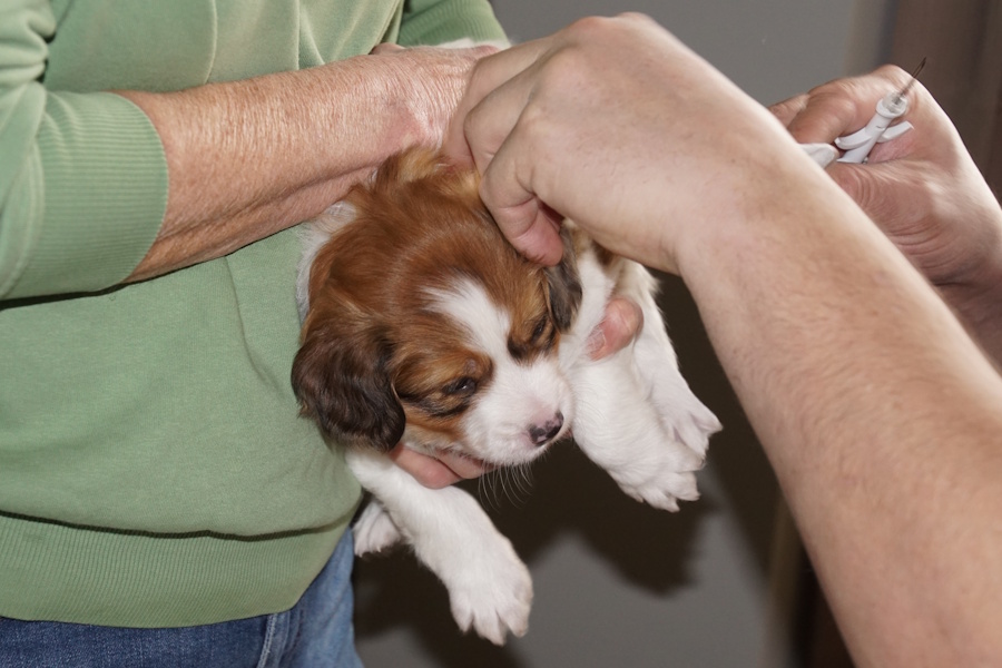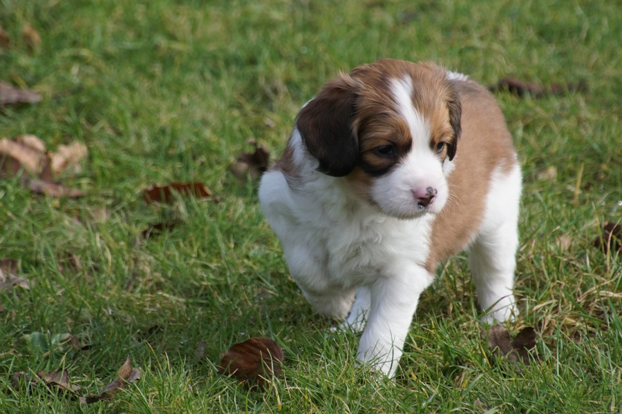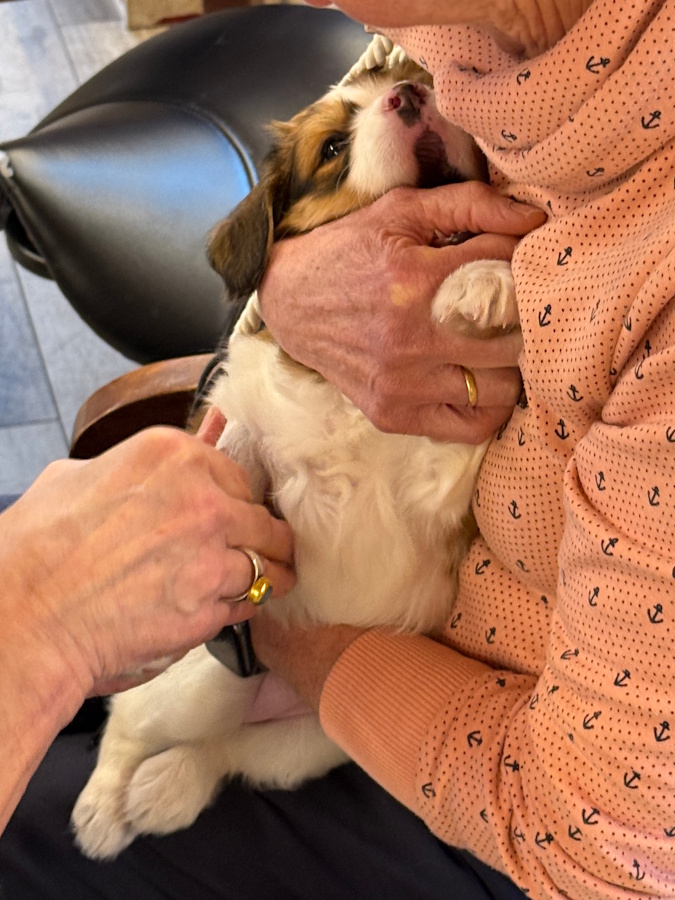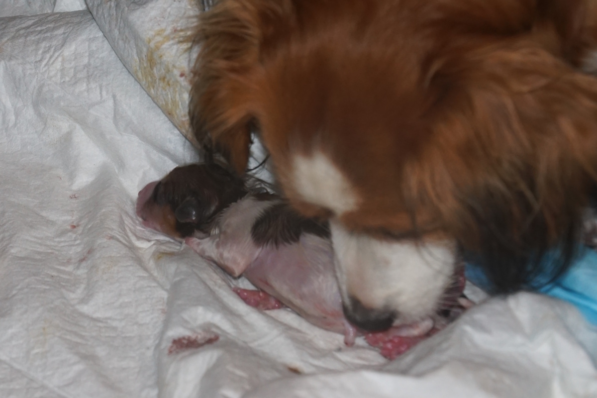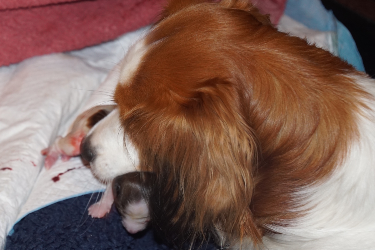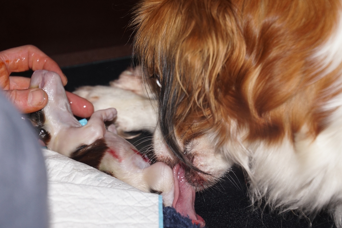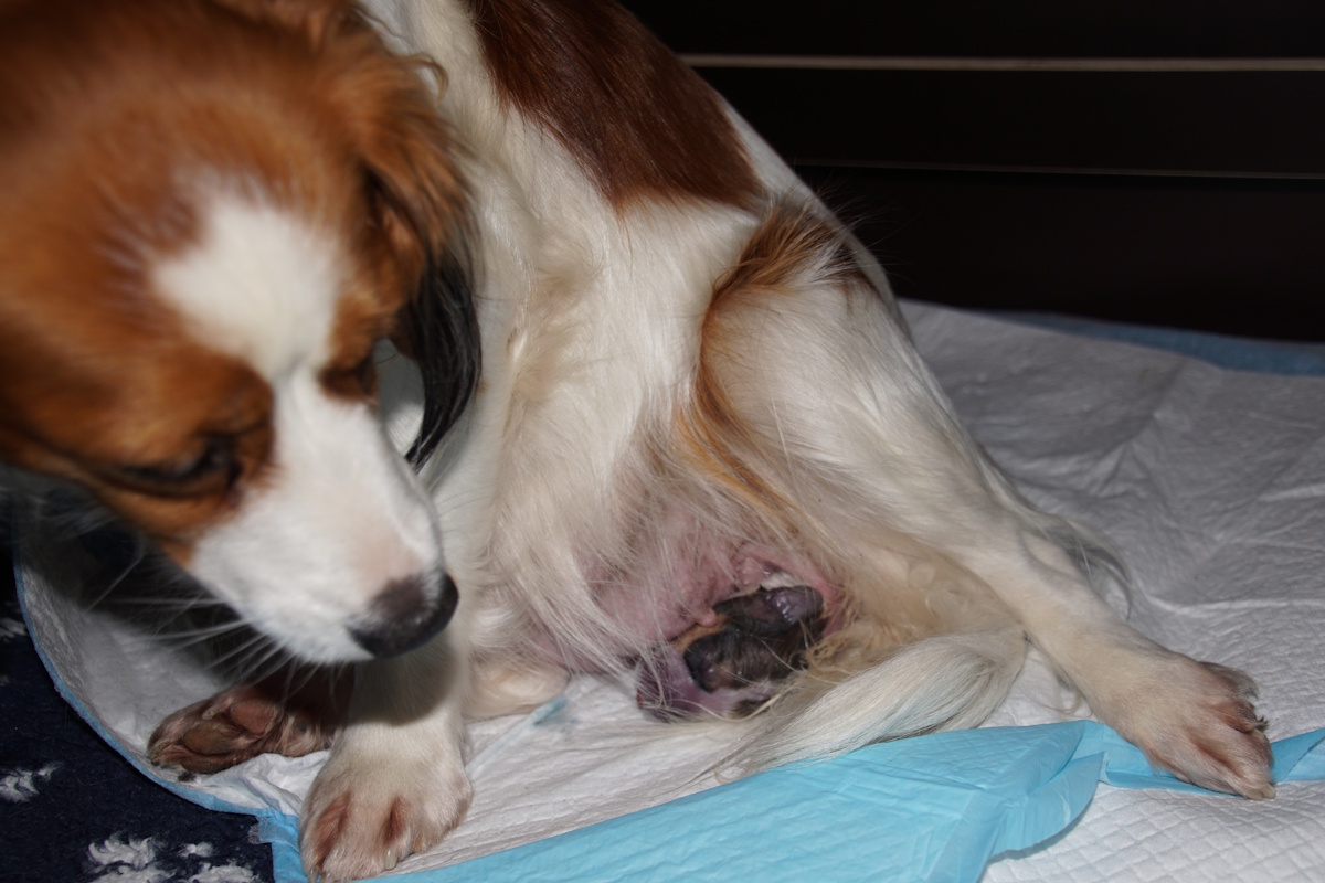 Omdat we haar goed in de gaten hielden, bleek dat, hoewel bijna niet merkbaar, zij al persweeën had en de eerste pup al zichtbaar in aantocht was.